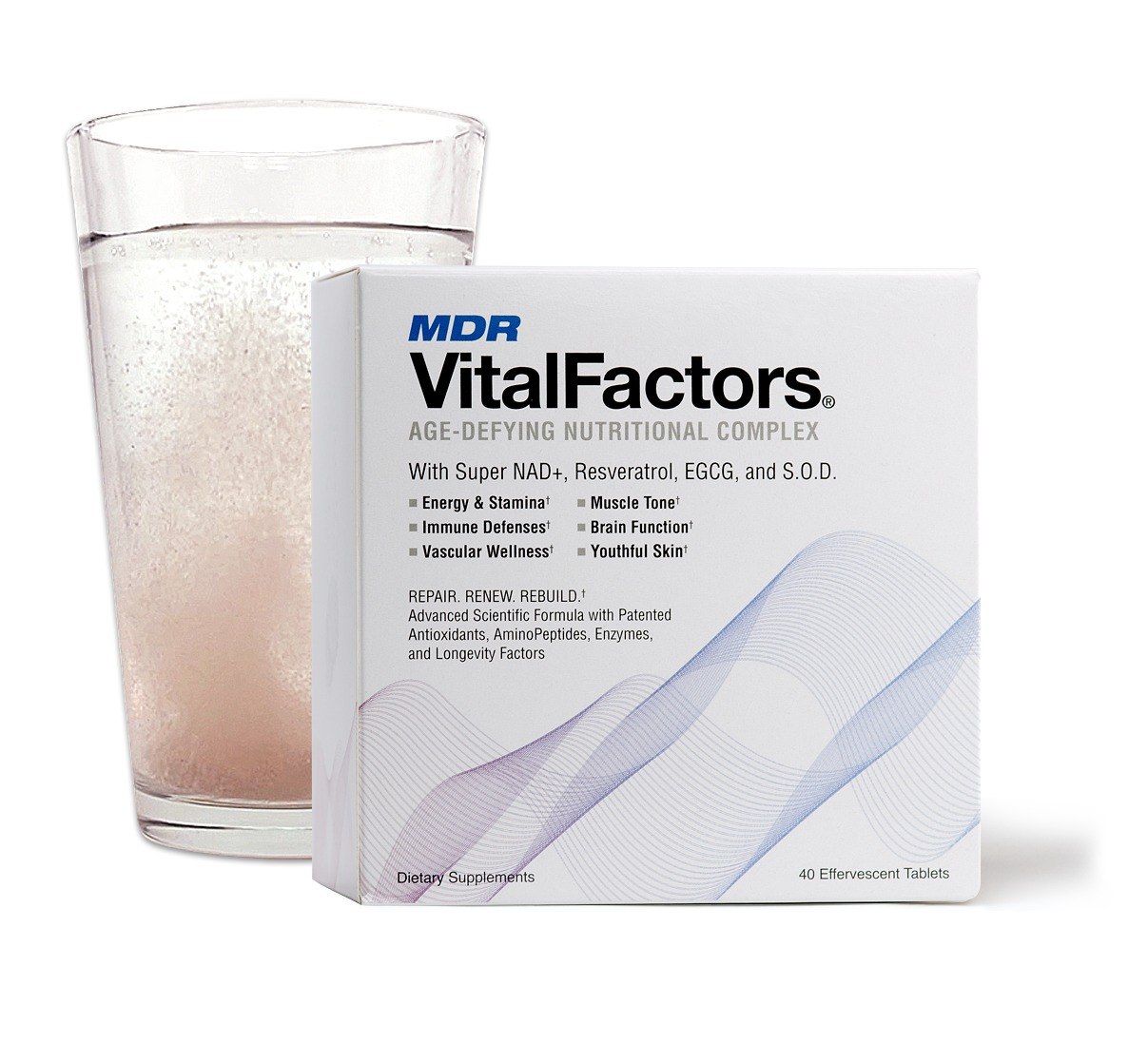 VitalFactors box with effervescent tablet dissolving in glass